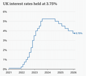 The Bank of England has held the base rate at 3.75% at today’s Monetary Policy Committee meeting.
